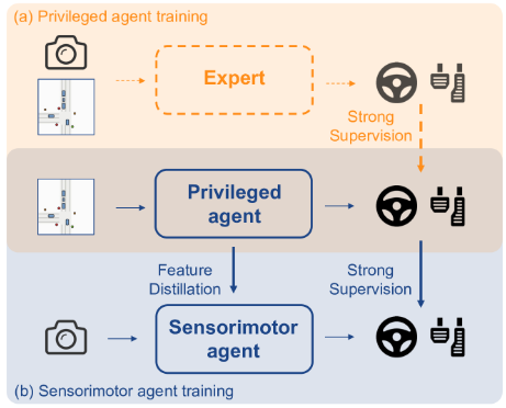 (a)特权代理通过访问特权真实信息来学习稳健的策略。专家用虚线标记,表明如果特权代理通过 RL 进行训练,则不是强制性的。(b) 感觉运动智能体通过特征蒸馏和输出模仿来模仿特权智能体。