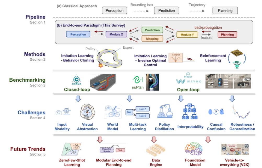 我们首先讨论端到端自动驾驶系统的动机和路线图。端到端方法可以大致分为模仿学习和强化学习,我们对这些方法进行了简要回顾。我们涵盖闭环和开环评估的数据集和基准。我们总结了一系列关键挑战,包括可解释性、泛化、世界模型、因果混乱等。后续文章我们将接续本文进一步讨论端到端自动驾驶索要面临的一系列挑战。并重点分析其应该接受的未来趋势,帮助读者可以有效的整合数据引擎、大型基础模型和车辆到一切的最新发展。