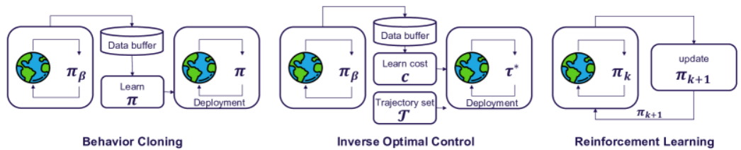 。IL 的一个重要且广泛使用的类别是行为克隆(BC,Behavior Clone),它将问题归结为监督学习。逆向最优控制(IOC),也称为逆向强化学习(IRL),是另一种 IL 方法,它利用专家演示来学习奖励函数。我们将在以下几节中详细说明这两个类别。2.2 行为克隆