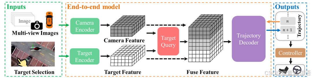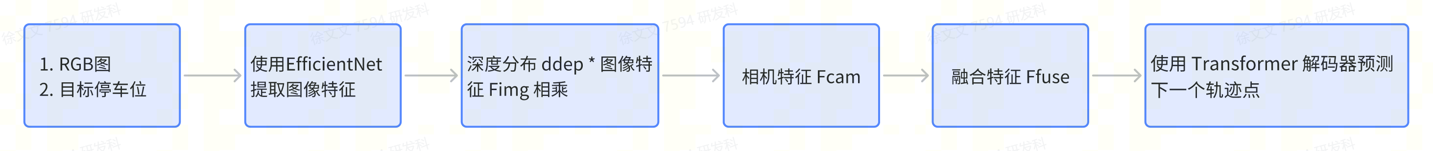 多视角 RGB 图像被处理,图像特征被转换为 BEV(鸟瞰图)表示形式。使用目标停车位生成 BEV 目标特征。我们通过目标查询将目标特征和图像 BEV 特征融合。然后我们使用自回归的 Transformer 解码器逐个获得预测的轨迹点。