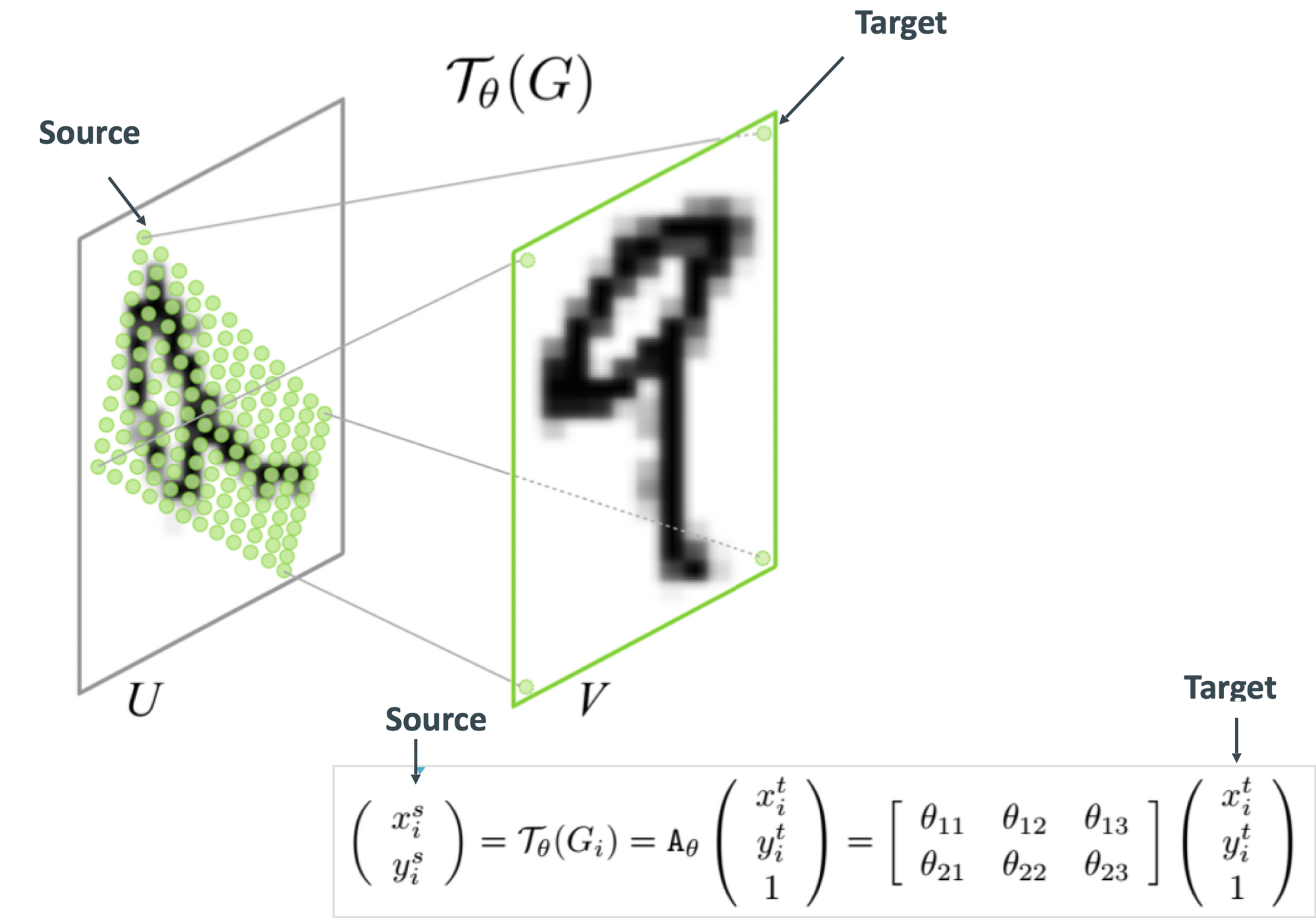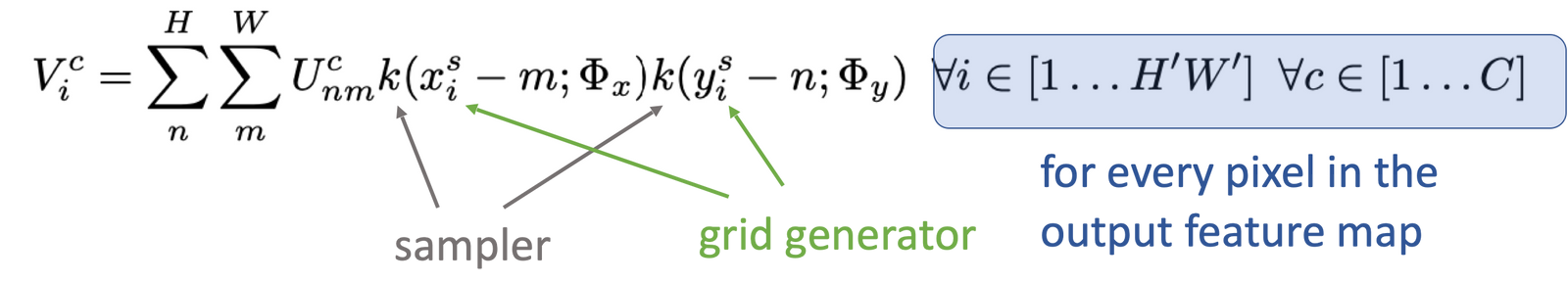 首先,请注意这里的 U 和 V 都是特征图。这意味着通常不会在图像上应用空间变换器,而是在特征图上应用空间变换器。输出也是一样,都是特征图!