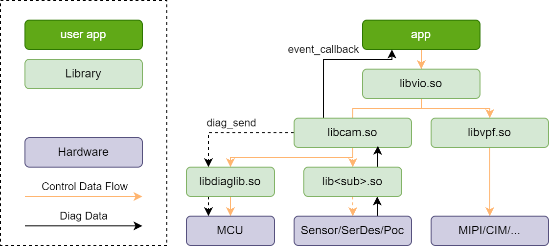 此处libcam中的诊断报告默认使用诊断API进行诊断状态报告,因此在应用集成时若编译报错,需注意对该libdiaglib库的引用。