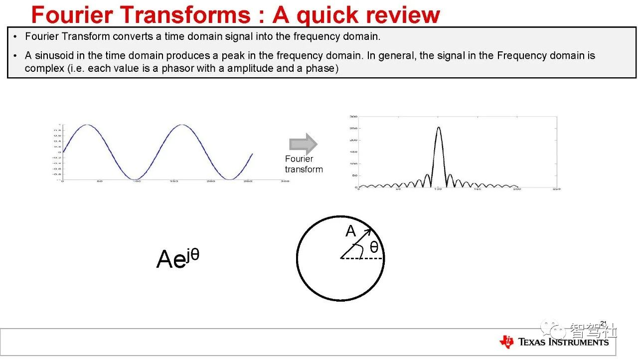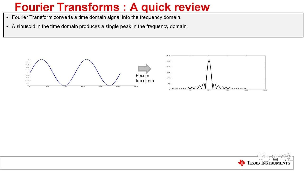 这个包含多个单音信号的 IF 信号必须使用傅里叶变换加以处理,以便分离不同的-单音。傅里叶变换处理将会产生一个具有不同的分离峰值的频谱,每个峰值表示在特定距离处存在物体。