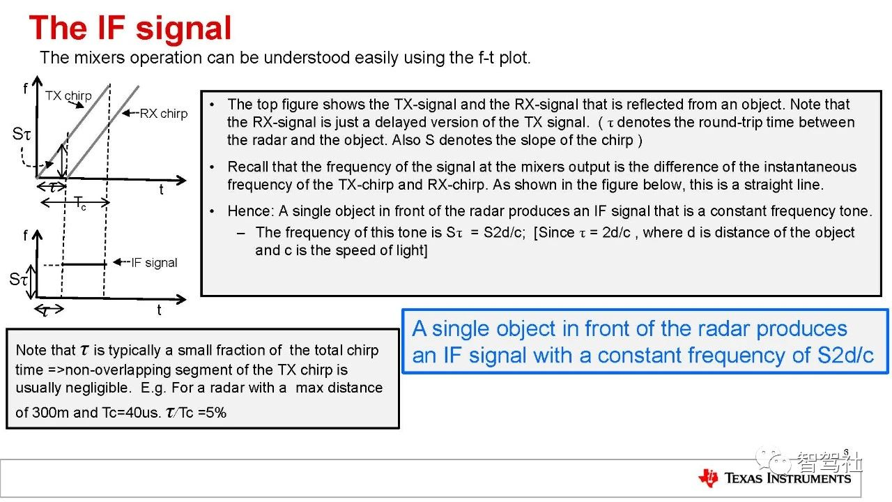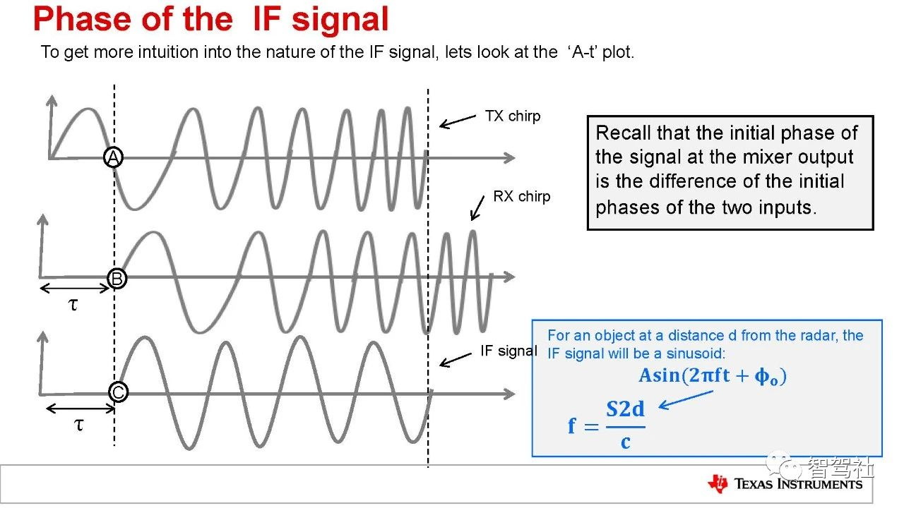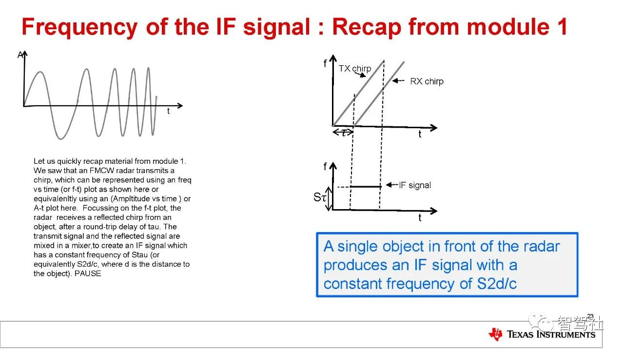 总之,对于与雷达的距离为 d 的物体,IF 信号将是一个正弦波(方程式7),因此: