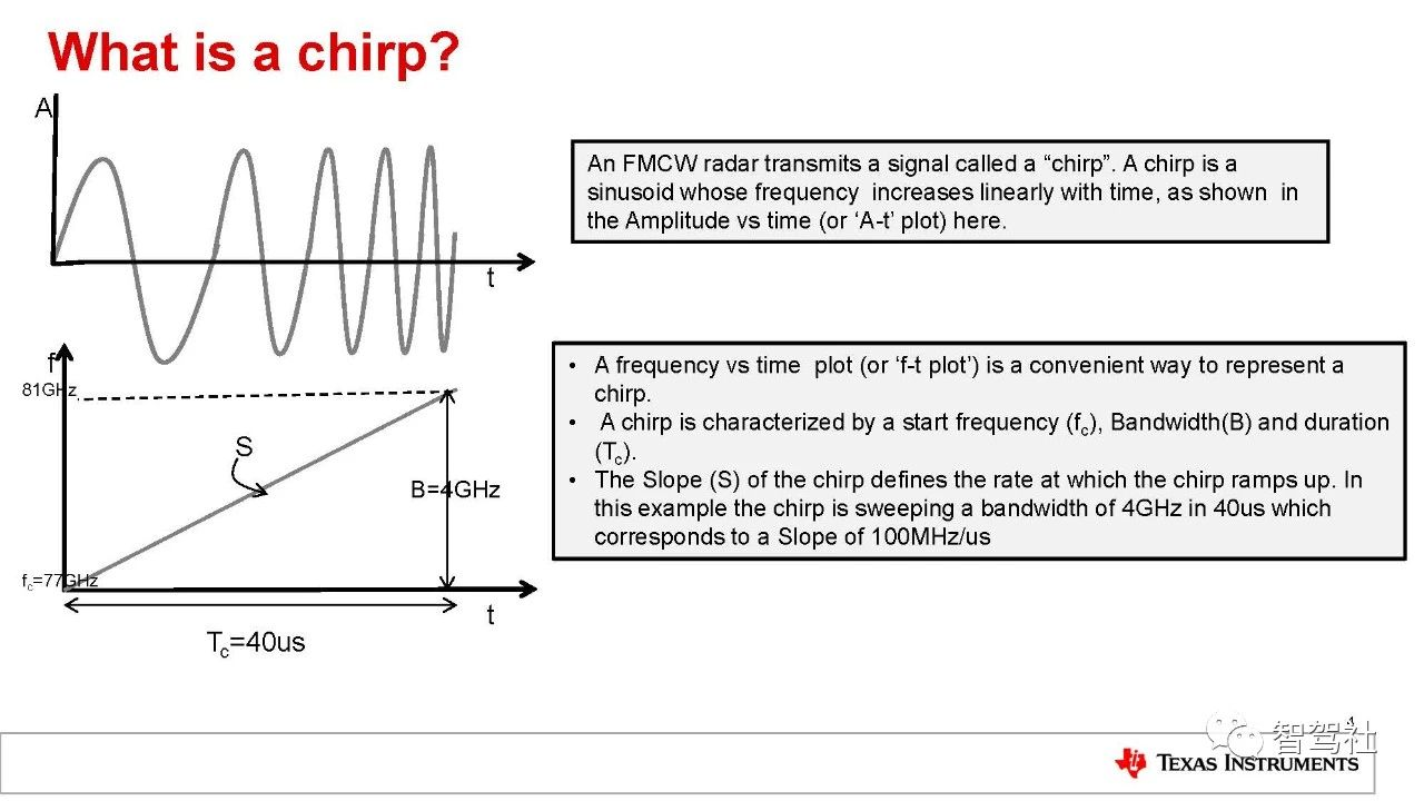 图 2为同一个线性调频脉冲信号(频率作为时间的函数)。该线性调频脉冲具有起始频率 (fc)、带宽(B)和持续时间 (Tc)。该线性调频脉冲的斜率 (S)捕捉频率的变化率。在例子中图 2 提供的示例中,fc = 77 GHz,B = 4 GHz,Tc = 40 µs,S = 100 MHz/µs.