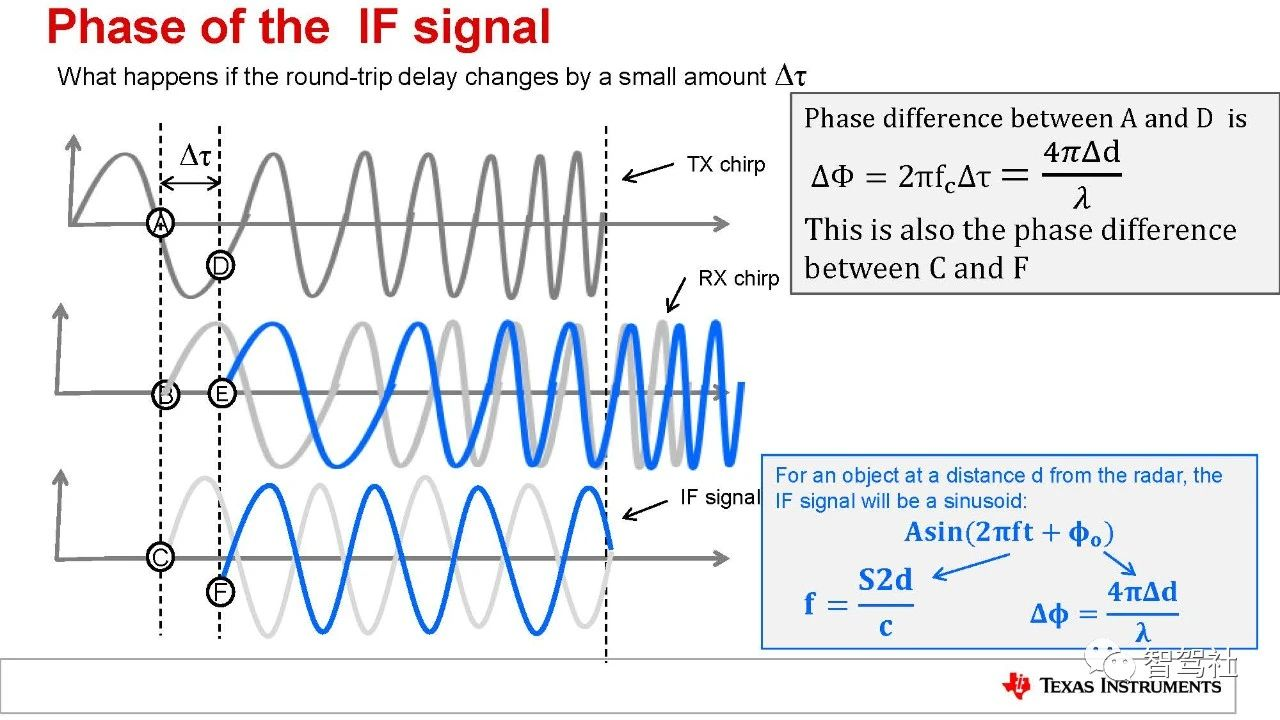 该方程式是一个近似等式,仅在斜率和距离足够小时才有效。不过,IF 信号的相位与很小的距离变化呈线性关系(即Δf=4πΔd/l)仍然是正确的。