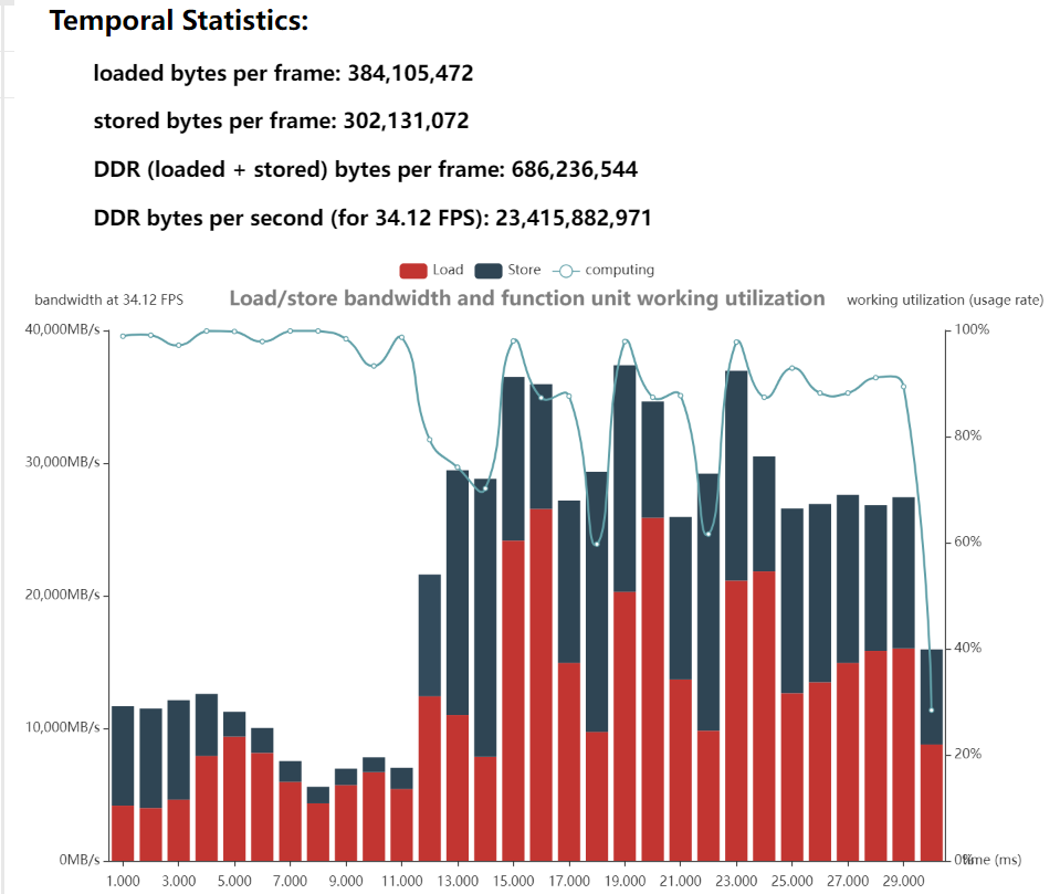 可以看到,图中由多处的load&store柱状图高于computing曲线,这些地方可能存在了带宽瓶颈。