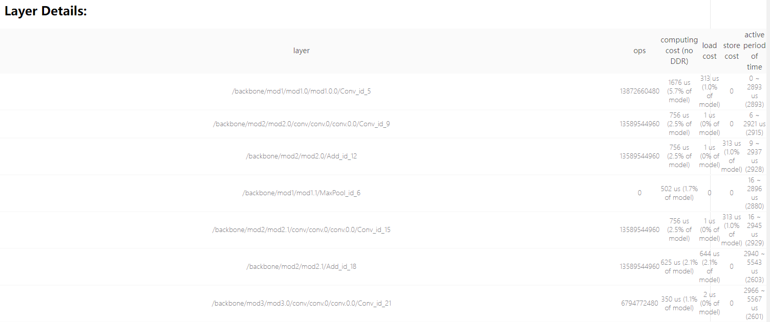 编译后layer的时间开销,不包括DDR相关的时间开销,但会包含reorder(数据重排)的开销