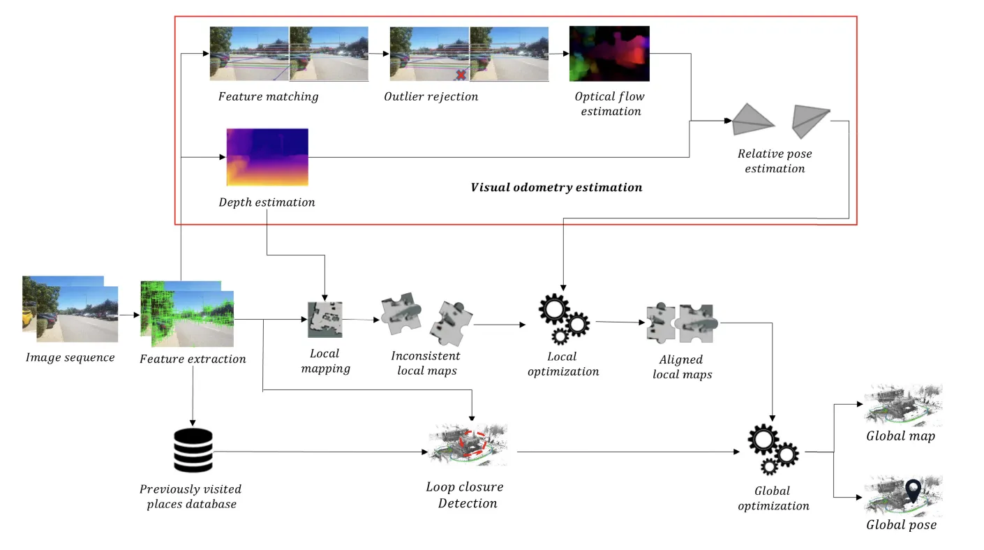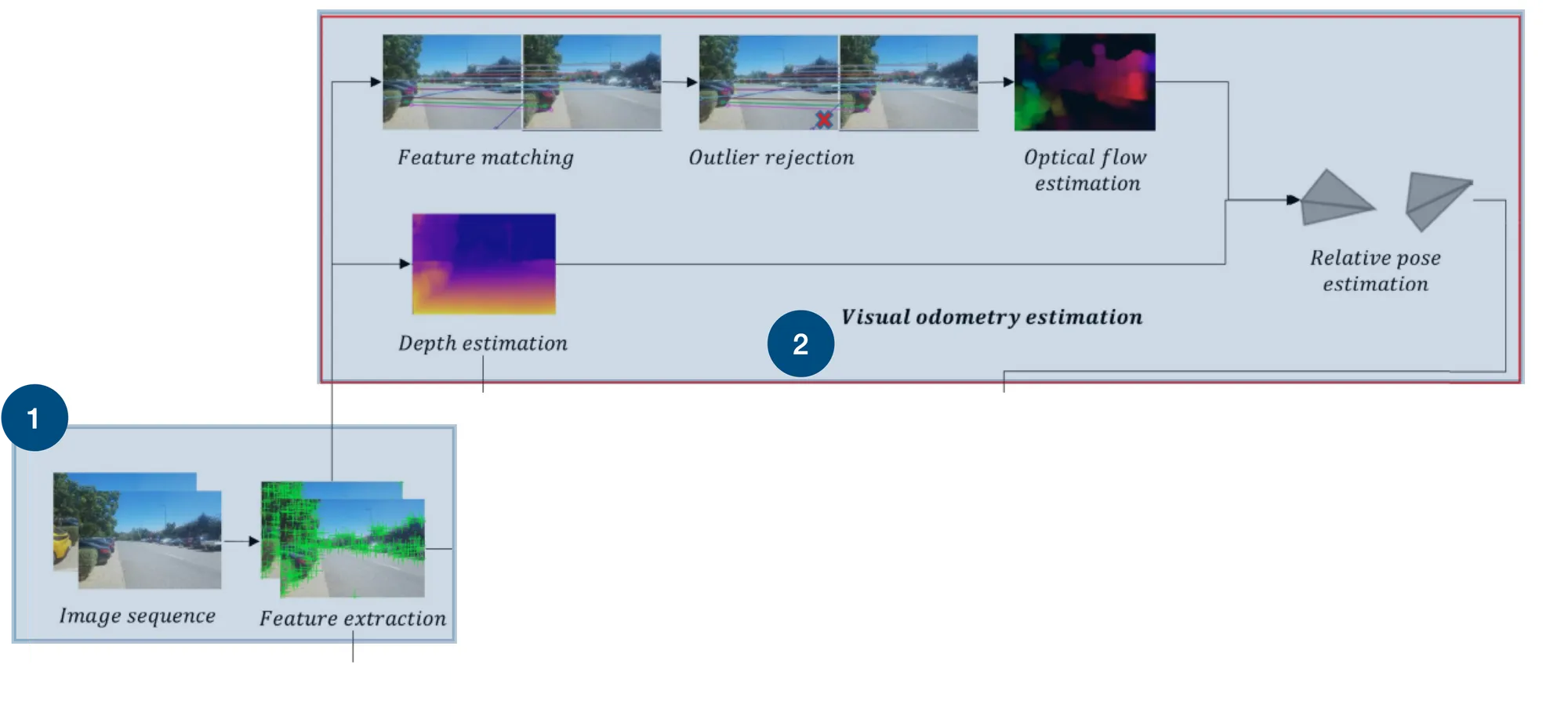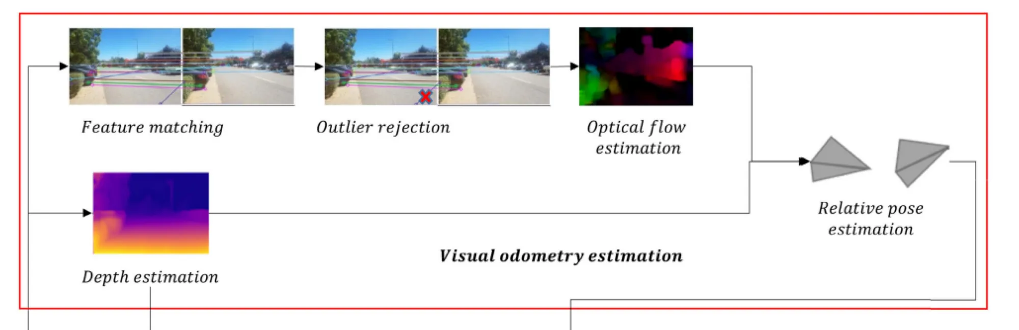 为此,我们建立了一个管道,通过分析一系列图像中特征的视运动变化来估计摄像头的运动。