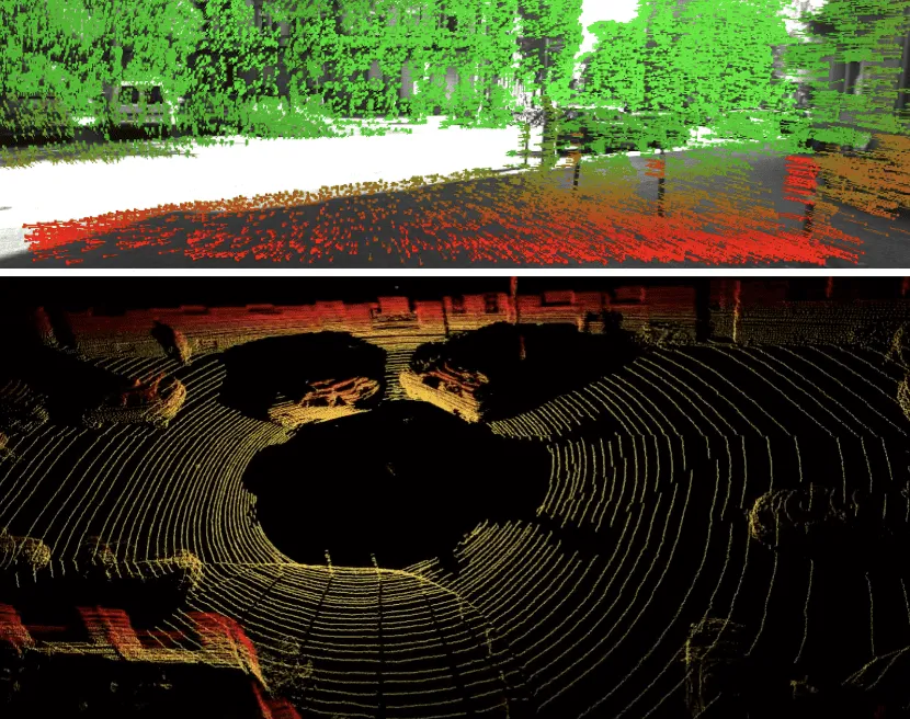 这里将使用算法来计算视觉特征(边、角、梯度等)。下图显示了上图(视觉特征)和下图(点云)。
