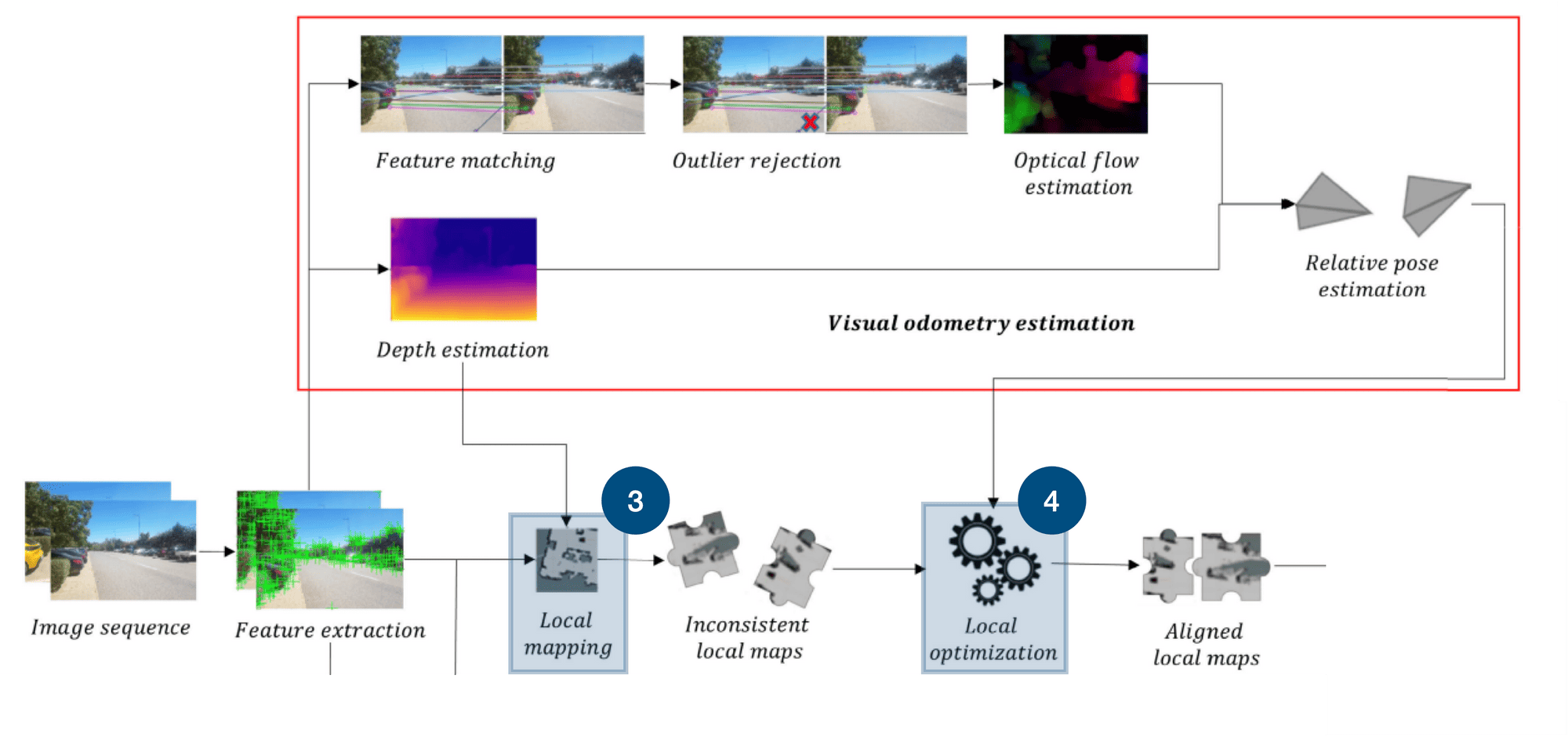 局部优化: 这一步使用名为 “捆绑调整 ”的方法完成。我不会在这里对它进行描述,但它是一种算法,可以最大限度地缩小图像中观察到的特征位置与根据摄像机模型和 3D 点估算得出的预测位置之间的差距。