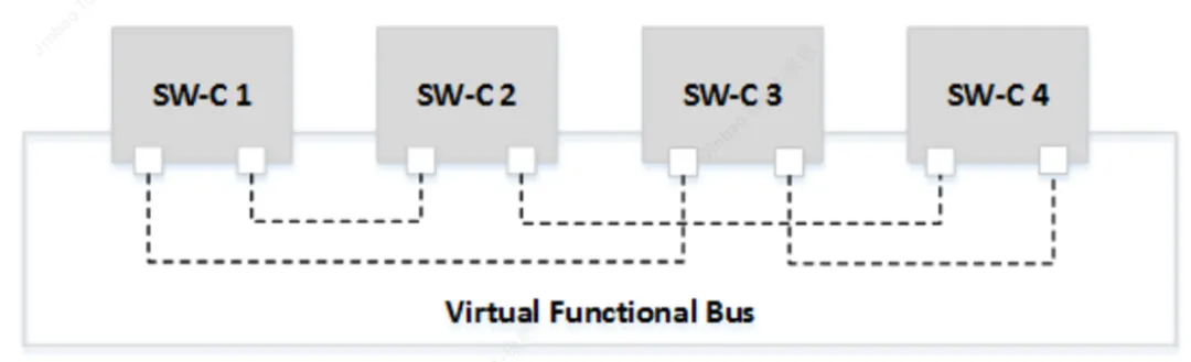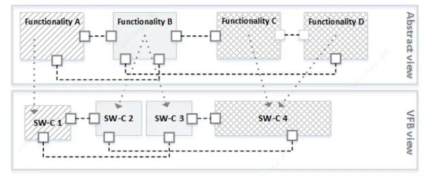 AUTOSAR 的分层式设计,用于支持完整的软件和硬件模块的独立性(Independence),中间 RTE(Runtime Environment)作为虚拟功能总线 VFB(Virtual Functional Bus)的实现,隔离了上层的应用软件层(Application Layer)与下层的基础软件(Basic Software),摆脱了以往 ECU 软件开发与验证时对硬件系统的依赖。软件组件的交互是基于虚拟功能总线(Virtual Function Bus, VFB )进行的。在 VFB 上,软件组件之间通过端口(Port)交互,Port 的类型由接口(Interface)定义。接口控制了软件组件间通讯的内容和语义。Port 和 Interface 的组合被称为 AUTOSAR Port Interface。VFB 使得设计者在设计软件组件时不必考虑它们会被分配在哪个 ECU 上,也不必考虑网络拓扑结构和 ECU 在车辆网络中如何通讯。这就意味着,通过 VFB,在车辆 ECU 间的电气架构确定之前,就能够确定系统的整个功能。