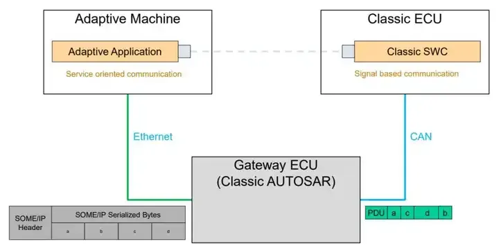 在引入 SOA 架构之后,汽车软件工程师不得不面临的一个问题是,基于以太网的服务(service)的域控制器,区域控制器等,如何能和只有基于信号(signal)工作的 ECU 相互兼容并工作。