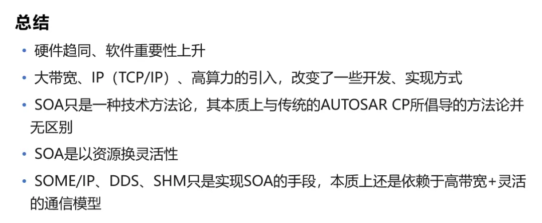 前面分析来看,CP 和 SOA 在顶层设计来看,并没有什么本质的区别,所以对于功能定义者和开发者来说,原有的工作和困难(软件的根本困难)并没有发生变化;而 soa 带来的灵活性也没能解决所有的问题,并且又带来很多新的问题,比如:确定性和可靠性。而车是一个高度集中又同时是一个分布式系统,其分布式节点的变少才是导致开发变简单的关键。但是原有分布式系统的兼容性、一致性,依然是存在的,并不会因为引入了 SOA 就没有了。ps:想起前段时间跟前同事吃饭,据描述,他们的软件发版经常出现基础软件和应用软件接口不兼容的问题,并为此特地预留 2 周做接口的兼容集成。