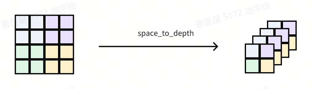 S2DDown (Space2Depth Downsample) 使用一个 space to depth 操作进行降采样,以 stride = 2 为例,降采样后,feature 的空间维度将变为原来的 1/2,channel 维度将变为原来的 4 倍。对应的代码实现为: