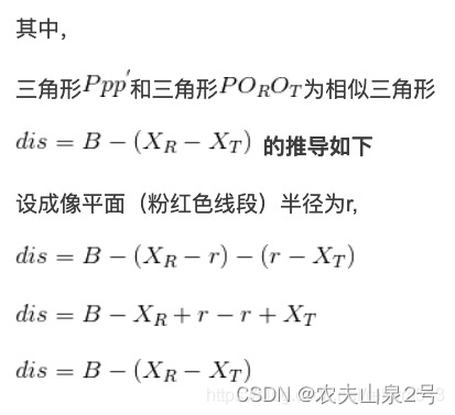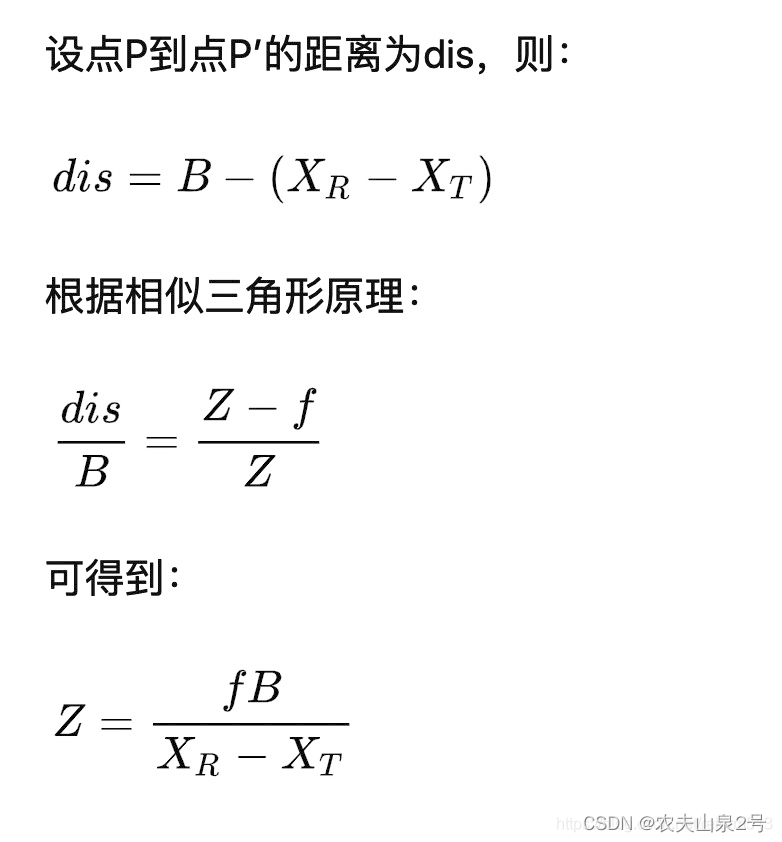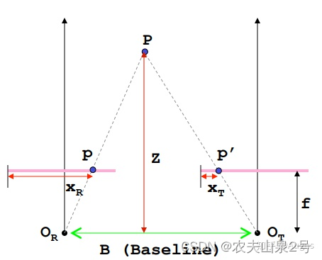 公式中,焦距f和摄像头中心距B可通过标定得到,因此,只要获得了视差d=X_R−X_T,就可以计算出深度Z。