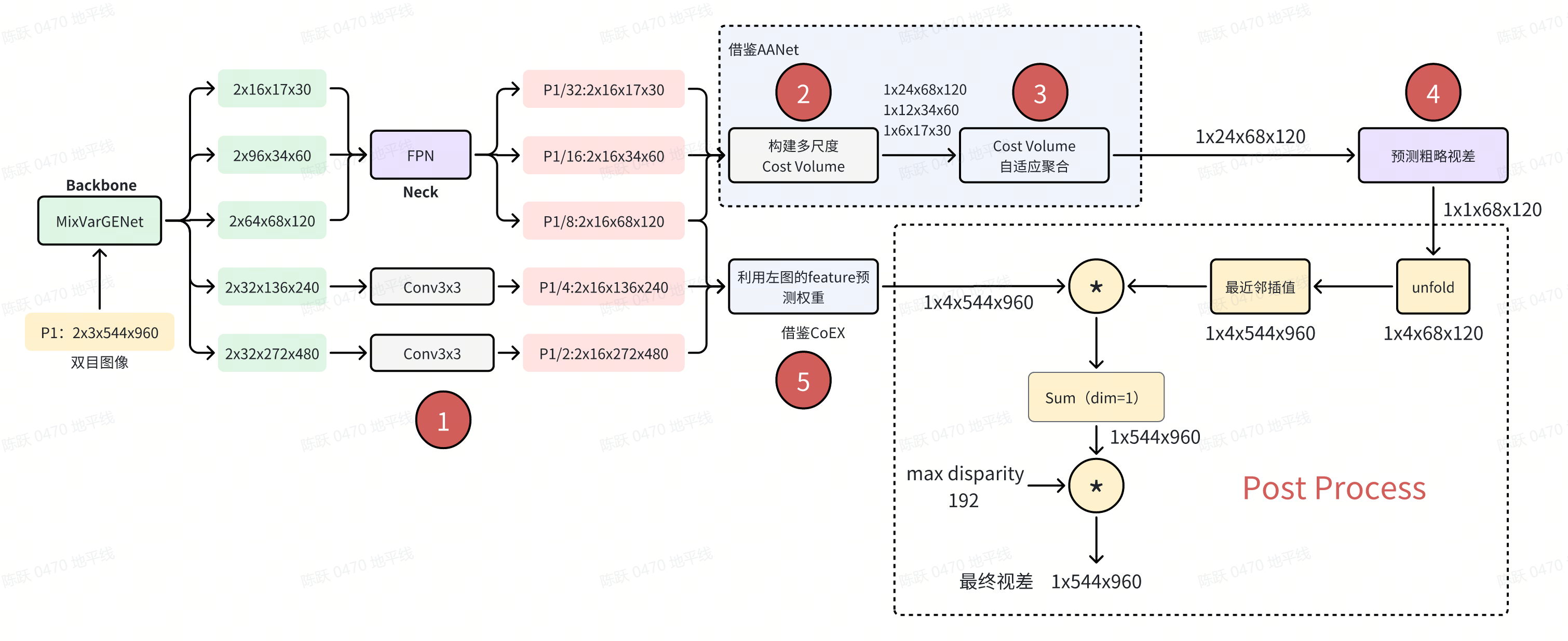 使用MixVarGENet+FPN来提取双目图像的多尺度特征;