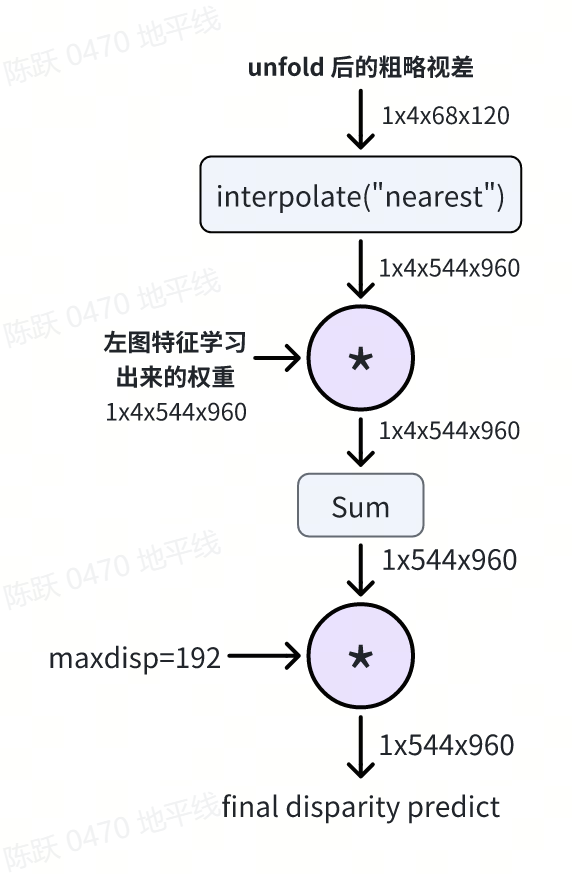 使用左图特征预测出权重,然后和上采样到原图尺寸的粗略视差相乘,这样就得到了最终视差。