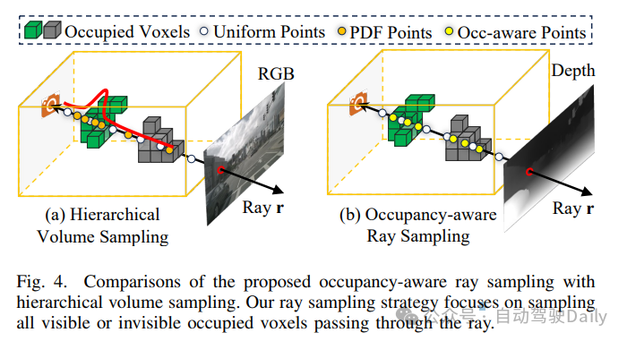 占用率感知的光线采样。先前的研究表明,沿着场景表面附近的光线采样点可以有效地提高渲染效率。图4(a)展示了分层体采样方法,该方法生成了一个沿着光线聚焦于表面的概率密度函数(PDF),以优化采样点。在SSC任务的NeRF模块中,目标是根据可见表面和不可见体素的特征来估计深度,而不是颜色或类别。NeRF分支的隐函数需要完成对整个场景的3D体素二值占用率预测。对于占用率预测的NeRF模型,直观地看,落在非空体素上的光线采样点可以提高渲染效果。因此,我们提出了一种占用率感知的光线采样策略,其中体积Vl的占用率预测结果Ol明确地指导体积中每条光线上的每个采样点,如图4(b)所示。