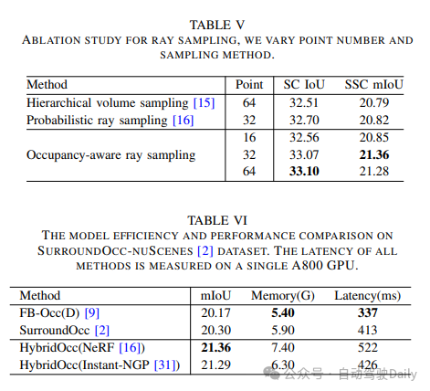 对于SurroundOcc-nuScenes和SemanticKITTI数据集,将2D到3D空间交叉注意力层的数量分别设置为6、3、1和3。每个级别的空间交叉注意力在每个参考点周围分别使用8、4、4和4个采样点。NeRF模块中隐函数f(·)的MLP结构与SceneRF一致。我们在占用率感知射线采样中每条射线使用32个点。占用率阈值θ设置为0.5。Occ3D-nuScenes数据集评估场景的可见表面,将我们的HybridOcc采样策略简单地设置为概率射线采样。我们在nuScenes数据集上训练了24个周期,在SemanticKITTI数据集上训练了30个epoch,默认学习率为2×10−4。所有模型均在4个NVIDIA A800 GPU上以bs为4进行训练。