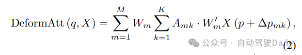 2D到3D的转换。受近期基于Transformer的多camera的3D感知方法的启发,将体素的3D参考点投影到2D相机上以聚合特征。具体来说,每个对应于查询的3D参考点,都根据给定的相机内参和外参投影到2D特征图上,并执行可变形交叉注意力(DeformAtt)来学习特征: