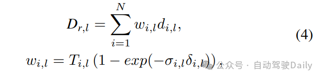 与大多数使用从密度到颜色的体渲染的NeRFs不同,我们尝试从辐射体显式地揭示深度。分别在多尺度图像特征X2、X3和X4上进行深度体渲染,以便多尺度特征可以获得深度监督。对于第l尺度的特征,我们将深度体渲染定义为: