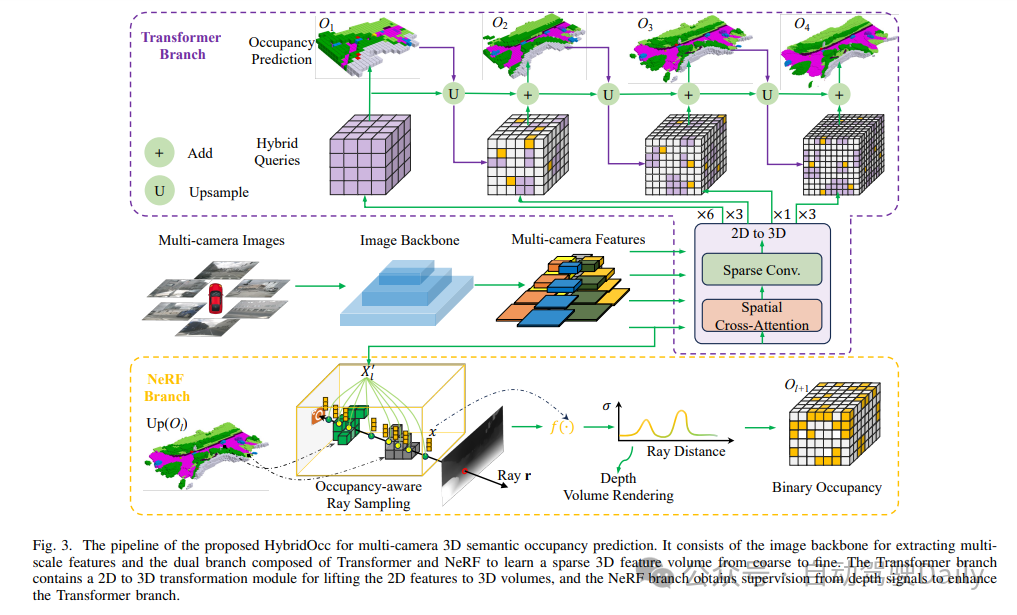 HybridOcc的总体流程如图3所示。以camera图像为输入,使用图像主干网络提取多尺度摄像头特征。然后,通过由Transformer框架和NeRF表示组成的双分支学习稀疏的3D体素特征。具体来说,Transformer分支通过2D到3D转换模块从多摄像头特征中学习3D体素形状的查询。混合3D查询proposal分别来自Transformer和NeRF,并以粗到细的方式逐步细化。在NeRF分支中,原始的NeRF范式被新的自动驾驶场景占用预测NeRF模块所取代。体渲染占用预测模型直接受深度监督,而不是RGB颜色。语义占用真实值监督多尺度体素语义占用预测。