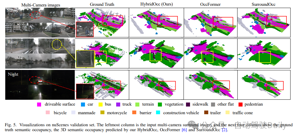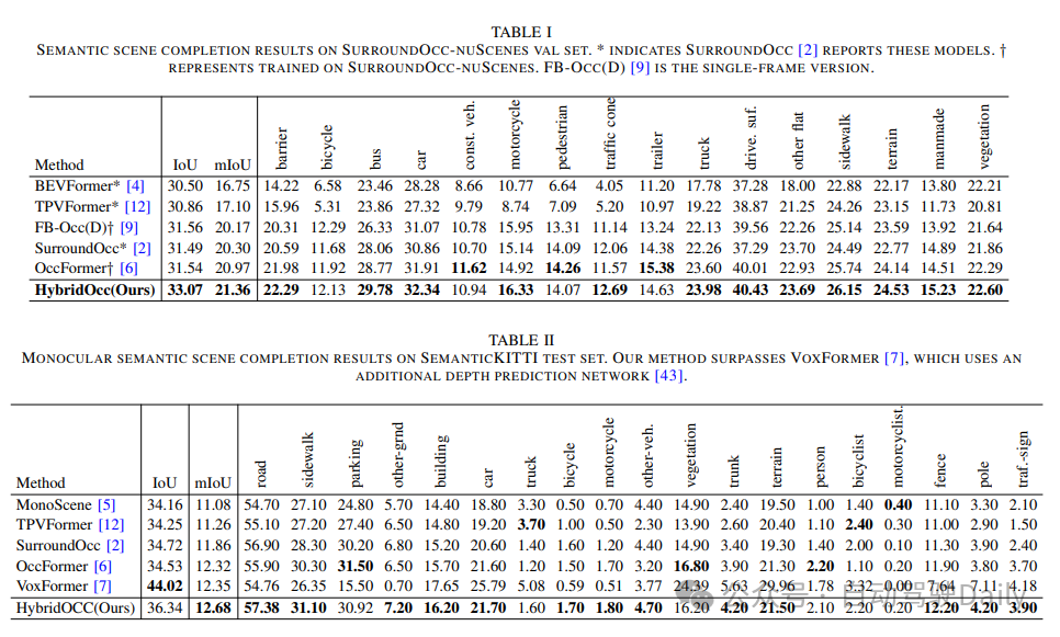 大量实验证明了HybridOcc的有效性,其性能优于基于深度预测网络的方法,如FB-Occ和VoxFormer。