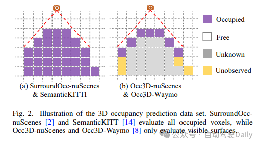 MonoScene 提出了直接通过特征投影将2D图像提升到3D体素以完成SSC任务。最近,一些工作提出了基于空间交叉注意力将多视角相机特征提升到3D表示。在Occ3D 提出的从粗到细的框架中,性能受限于缺乏深度信号。其它研究采用了额外的深度估计模块来提高3D体素表示的质量,如图1(a)所示。FB-Occ使用了预训练的深度预测模型和深度感知的反投影模型来辅助生成3D体素特征。然而,大多数基于深度的方法都集中在场景的可视表面上,缺乏对遮挡区域的推断。VoxFormer提出了一个额外的基于掩码自动编码器的模块来考虑遮挡体素,但其繁琐的两阶段结构不利于端到端模型训练。目前的各种方法都表明了深度信号对于SSC任务的重要性。值得注意的是,目前存在两种用于自动驾驶的不同功能的3D占用数据集。一种是仅评估可视表面(图2(b)),另一种则用于场景的完整占用,即SSC任务(图2(a))。本文更侧重于SSC任务,该任务考虑了遮挡的物体或区域。当前的SSC工作大多受到遮挡的影响,使得每个体素特征包含许多模糊性。因此,遮挡体素的占用预测仍面临挑战。