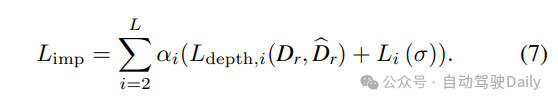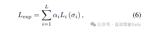 其中αi是第l尺度监督的衰减损失权重。高分辨率体素V4的混合查询需要足够的监督信号,对于NeRF分支的损失,使用二元交叉熵损失来进行类别无关的占用率预测,并利用SILog损失来优化深度,深度由激光雷达点的投影进行监督。同时也包括衰减损失权重α