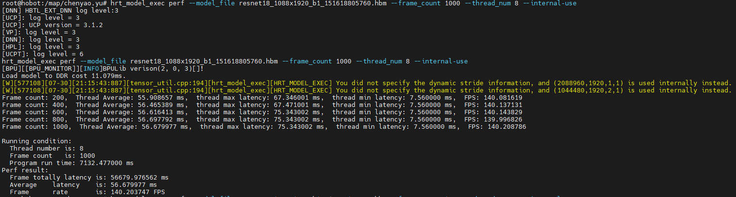 解答: hrt_model_exec perf --model_file resnet18_1088x1920_b1_151618805760.hbm --frame_count 1000 --thread_num 8 --internal-use