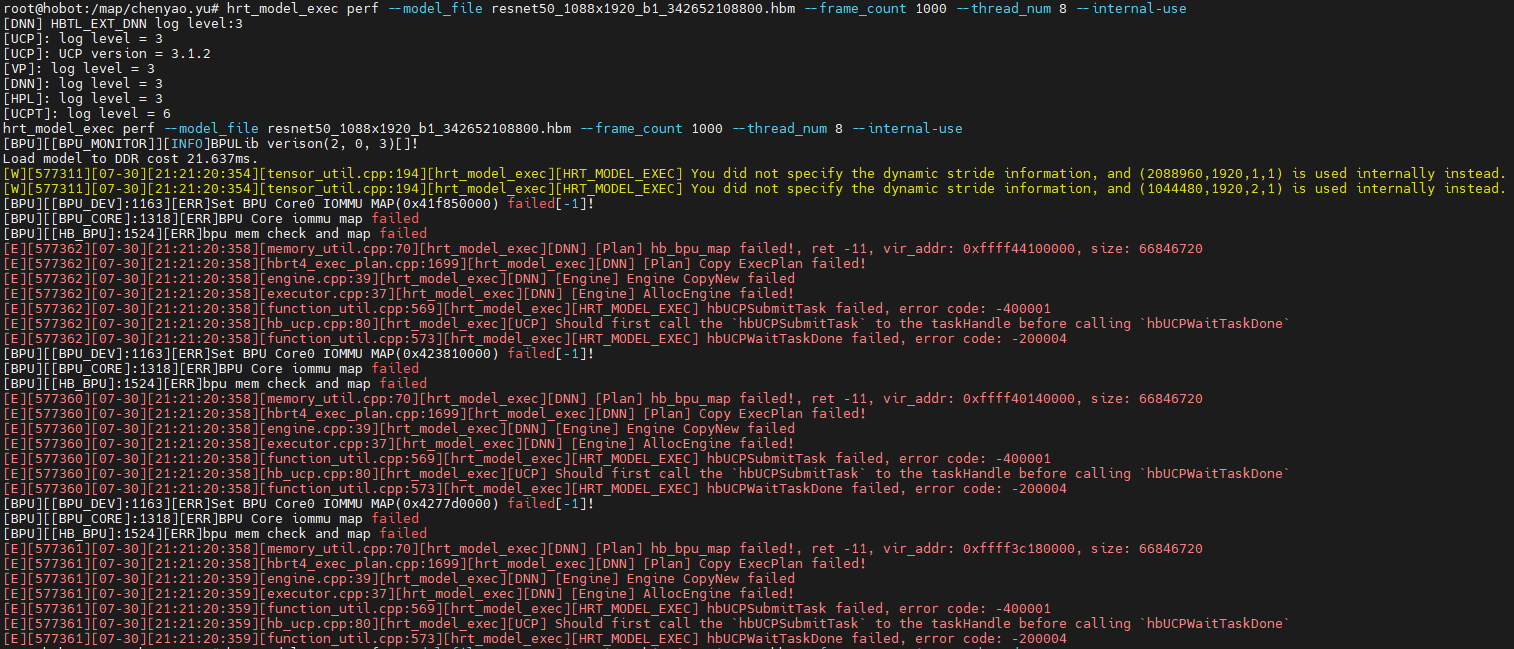 解决:hrt_model_exec perf --model_file resnet18_1088x1920_b1_151618805760.hbm --frame_count 1000 --thread_num 8 --internal-use 改为2线程,解决