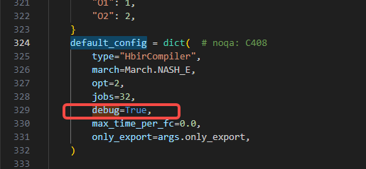 进入horizon_j6_open_explorer_v3.0.17-py310_20240705/samples/ai_toolchain/horizon_model_train_sample/scripts/tools/compile_perf_hbir.py脚本,配置default_config字典中的debug=True,如下所示: