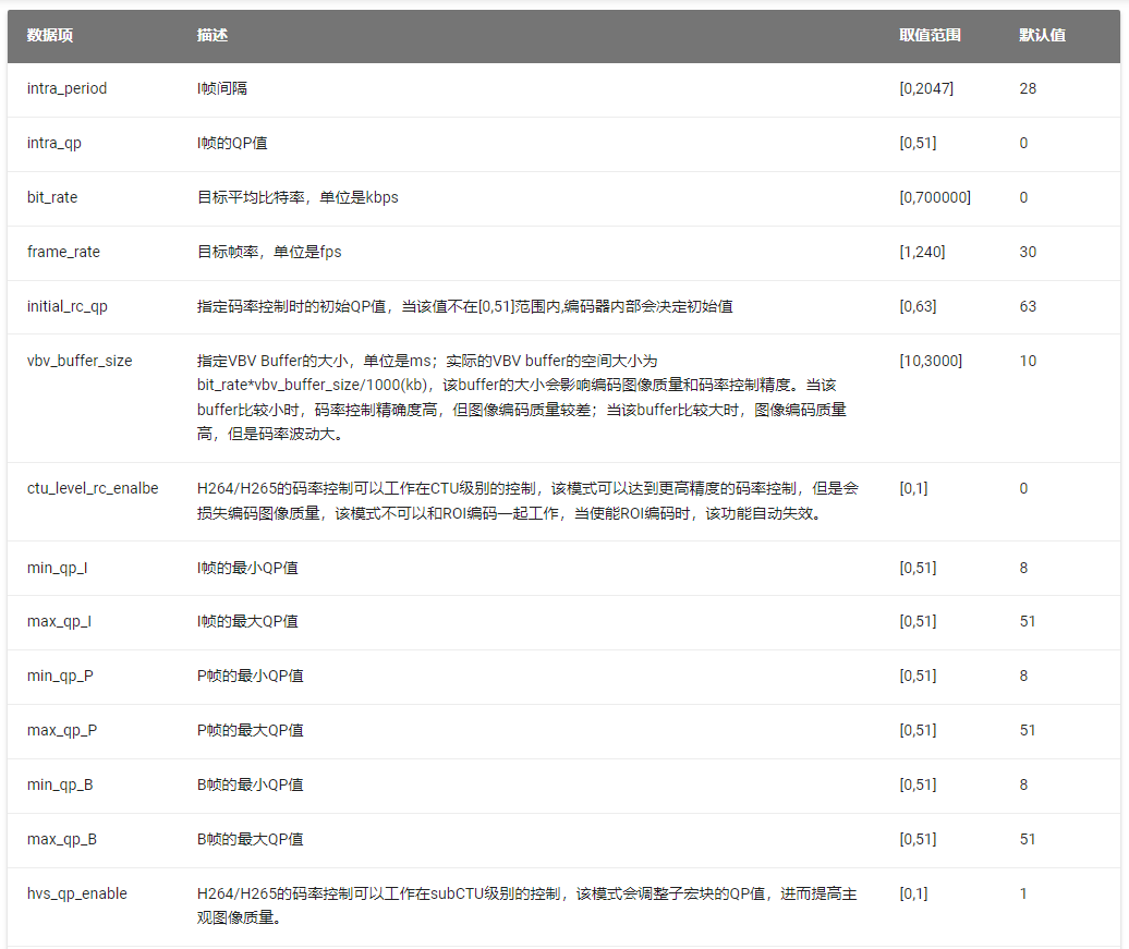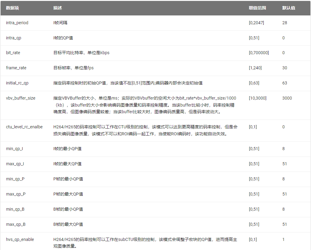 VBR表示可变码率,简单场景分配比较大的qp,压缩率小,质量高。复杂场景分配较小qp,可以保证编码图像的质量稳定。下面是VBR模式下各个参数含义: