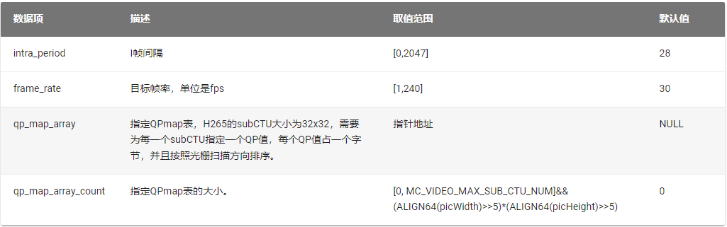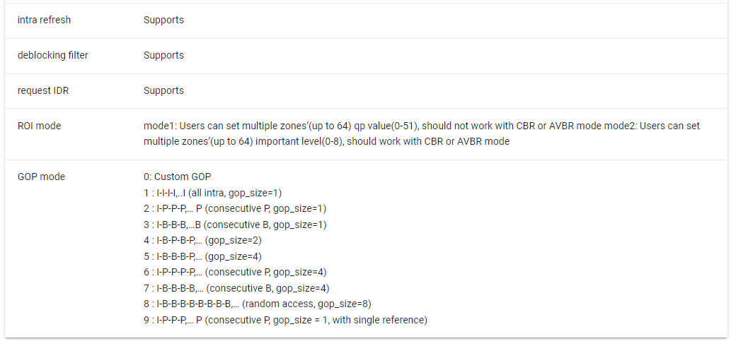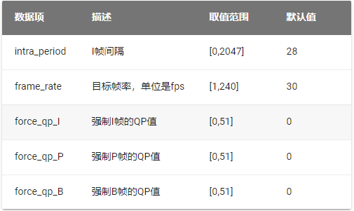 GOP结构表可定义一组周期性的GOP结构,该GOP结构将用于整个编码过程。单个结构表中的元素如下表所示,其中可以指定该图像的参考帧,如果IDR帧后的其他帧指定的参考帧为IDR帧前的数据帧,编码器内部会自动处理这种情况使其不参考其他帧,用户无需关心这种情况。用户在自定义GOP结构时需要指明结构表的数量,最多可定义3个结构表,结构表的顺序需要按照解码顺序排列。 下面表示了结构表中各个元素的含义: