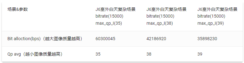 根据当前客户使用codec进行视频编码的场景,多将码率模式设置为CBR,当编码的场景较为复杂时,为了保证视频质量,硬件会自动提高码率值,导致输出的视频较预期更大。因此为了兼顾视频质量和实际码率,需要统筹bit_rate和max_qp_I/P值的设置。下面给出了全I帧模式下,不同复杂场景下,码率设置为15000kbps时,不同max_qp_I下实际码率和qp的情况(不同场景复杂程度不同,下列数据仅供参考):