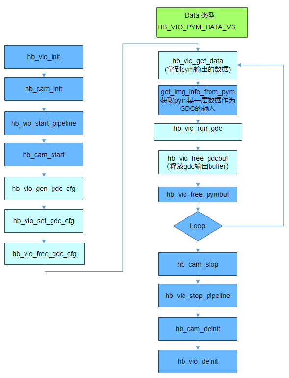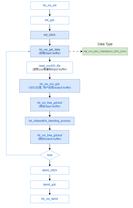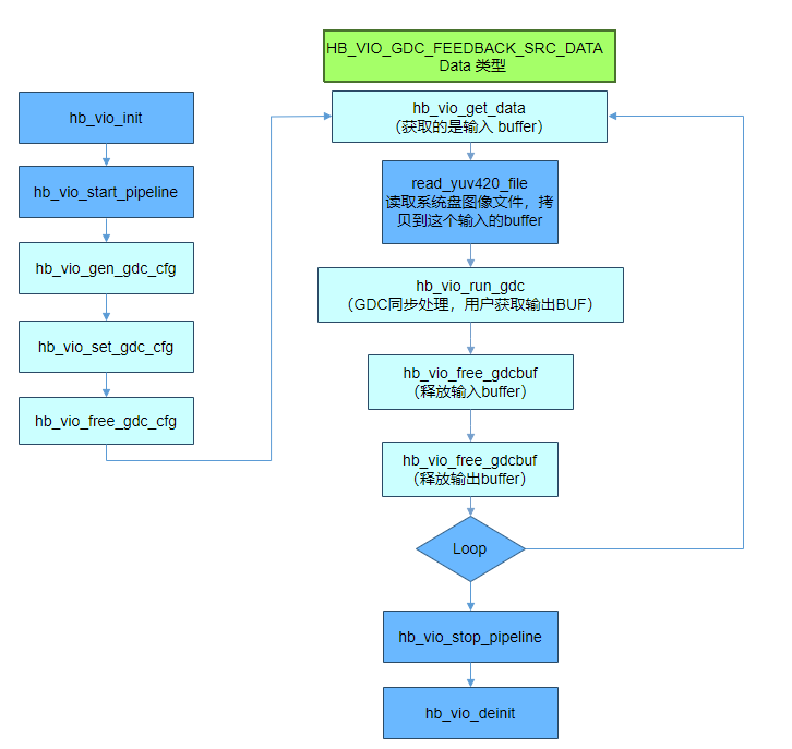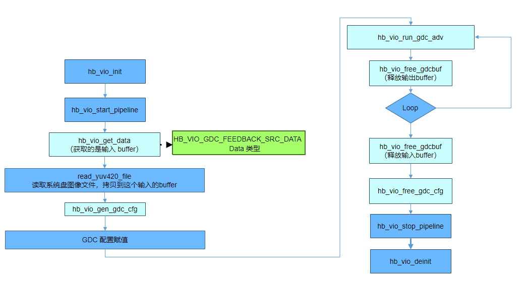 使用自定义GDC配置,和默认使用的区别,主要是hb_vio_set_gdc_cfg 的内容由接口直接带入,无需hb_vio_set_gdc_cfg接口。hb_vio_run_gdc核心处理函数改成hb_vio_run_gdc_adv。调用流程图如下: