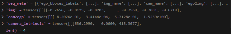 可以看到seq_meta内有3个连续时间序列的meta,每个meta内又包含ego_bboxes_labels、img_name、cam_name、ego2img、layout、color_space、scene、sample_token、ego2global、lidar2global、lidar2img、meta在内的12类信息,每个信息都有2份,这是因为batch_size_per_gpu =2。
