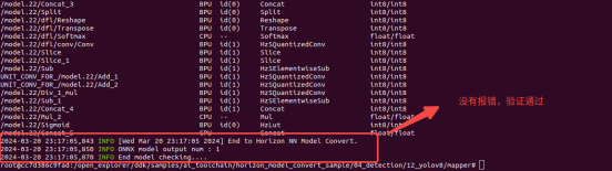 如果模型验证不通过,请根据终端打印或在当前路径下生成的 hb_mapper_checker.log 日志文件确认报错信息和修改建议, 更多说明请参考地平线文档模型验证章节。