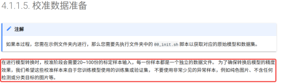 校准数据预处理: PTQ方案的校准数据一般是从训练集或验证集中筛选100份左右(可适当增减)的典型数据,并应避免非常少见的异常样本, 如纯色图片、不含任何检测或分类目标的图片等。筛选出的校准数据还需进行与模型inference前一致的预处理操作, 处理后保持与原始模型一样的数据类型( input_type_train )、layout ( input_layout_train )和尺寸( input_shape )。对于校准数据的预处理,地平线建议直接参考示例代码进行修改使用。详细内容地平线文档参见3.2.3.2. 校准数据预处理