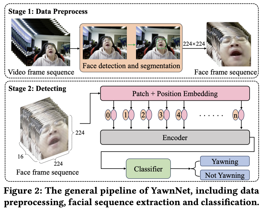 图2显示了YawnNet的总体流程。在数据预处理阶段,我们使用基于YOLOv5的深度神经网络进行面部检测和提取。由于打哈欠通常持续3-6秒,并且涉及一长串帧,我们使用随机帧方法来更有效地训练模型。它需要从原始视频中随机提取帧,以获得由64帧组成的压缩视频片段,然后使用步长为4的时间下采样将其进一步压缩为16帧。在检测阶段,我们使用ViT作为主干。224×224分辨率的图像最初被处理并分割成尺寸为16×16的视觉像素块。然后通过块嵌入将每个像素块转换为高维特征。然后,像素块被输入到编码器用于特征提取,并且输出762维的结果被用作线性分类器的输入以获得分类结果。在这里,我们详细介绍了两种主要的哈欠检测策略:立方体嵌入和Swin Transformer Block。