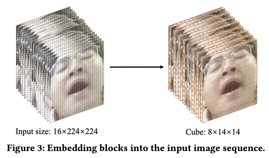 为了对数据中的时空关系进行编码,我们对输入图像使用联合时空立方体嵌入。如图3所示,它包括嵌入一个大小为2×16×16的立方体作为单个单元。为了实现这一点,将原来的16×224×224的大立方体划分为8×14×14的小立方体,并嵌入到低通道维度D中,作为后续层的输入。