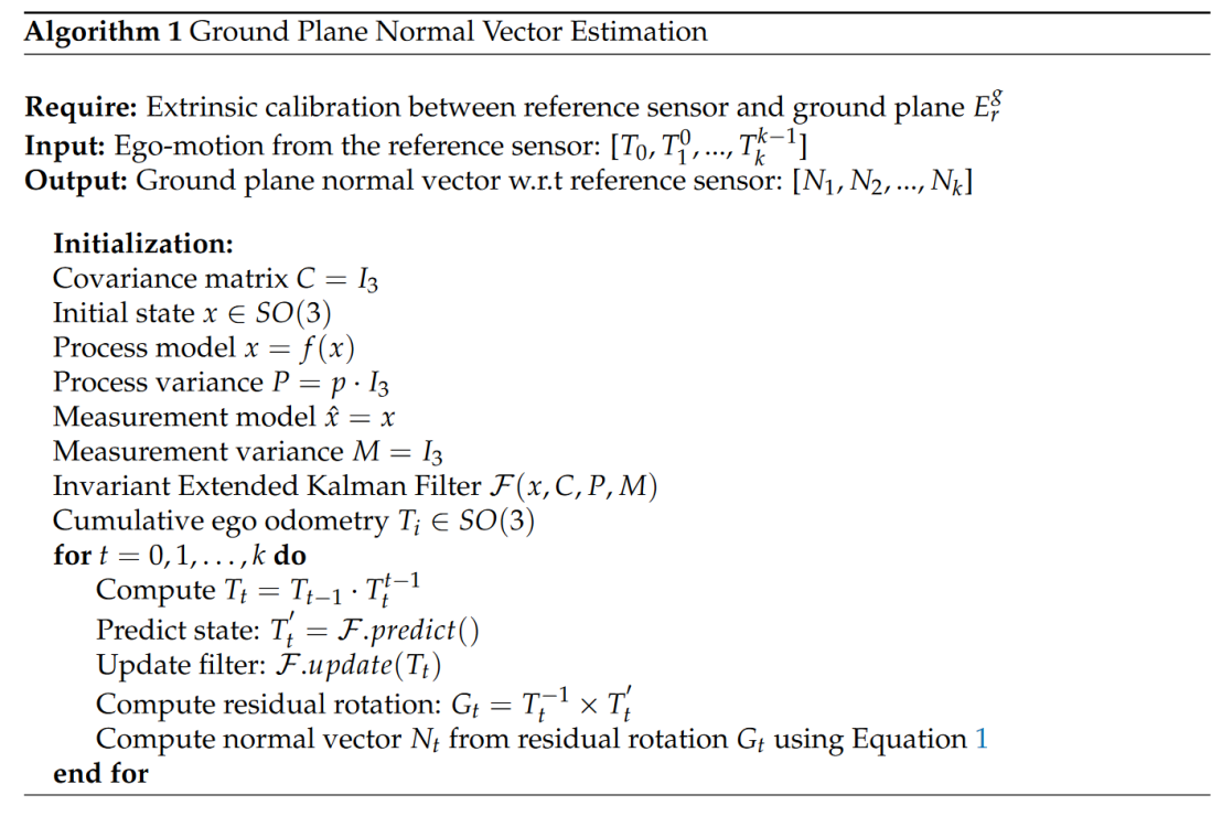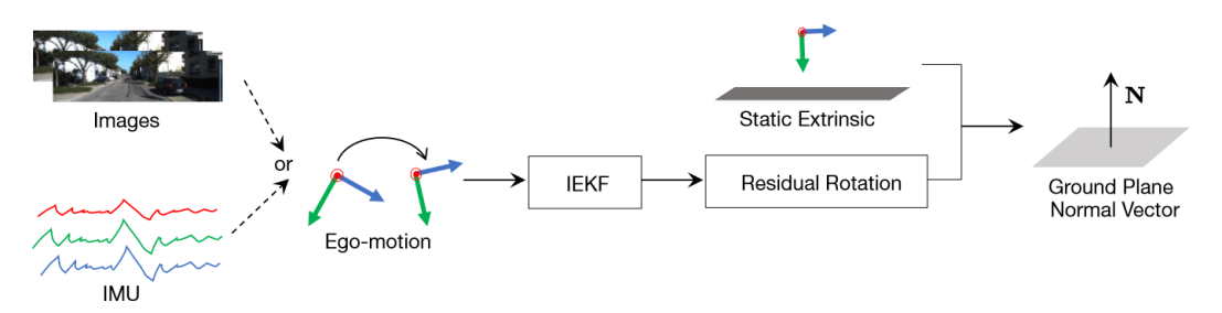提出的IEKF可以处理来自各种传感器的自我运动,例如IMU、来自单目图像的视觉里程计,以及可以提供实时里程计信息的SLAM系统。最终的地平面法线向量N是基于IEKF残差旋转和先前校准的静态外参的组合实时预测的。
