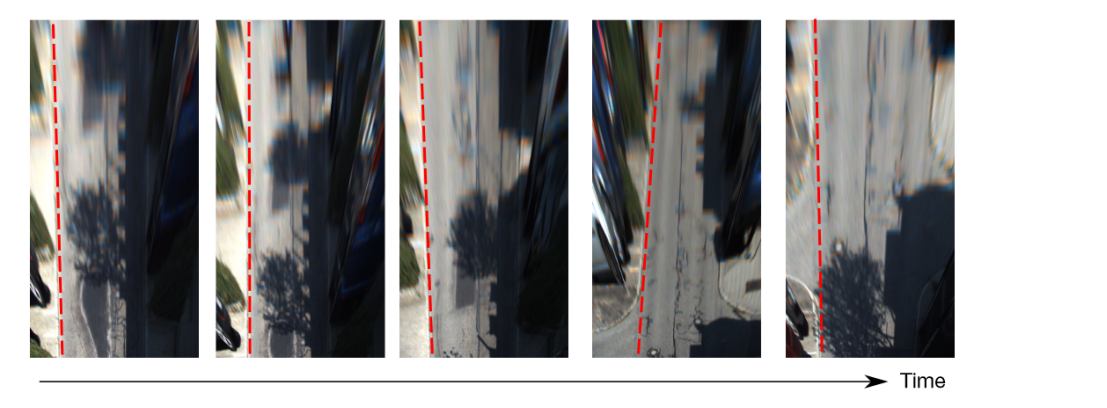 图1. 展示了前置摄像头在移动车辆上的典型动态运动。尽管车辆直线行驶,路面看起来足够平坦,但俯仰角(绕x轴旋转)实际上在大约1度的振幅内波动。当车辆遇到不完美的路面和减速带时,这种俯仰角的振荡会被放大。