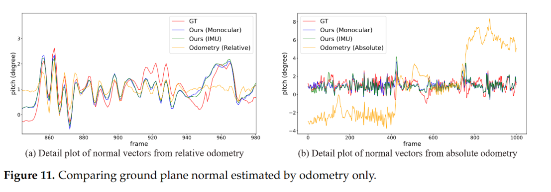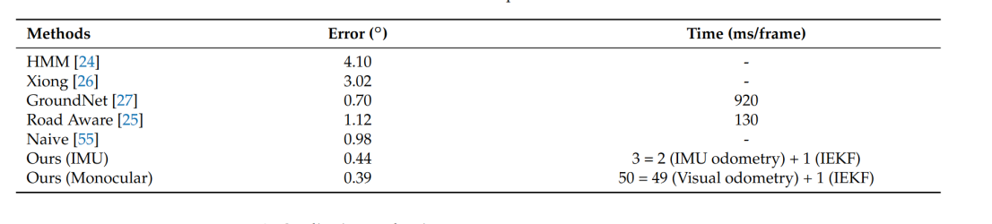实验结果表明,本文方法在单目和仅IMU里程计方面均取得了令人满意的精度。例如,在KITTI数据集上,与现有方法相比,本文方法将估计的向量误差从3.02°降低到0.39°。此外,基于单目的方法相较于仅使用IMU的里程计,提供了稍微更佳的结果。本文方法还显著减少了计算时间,每帧在3-50毫秒之间,进一步证明了其实时估计准确地平面法线向量的能力。