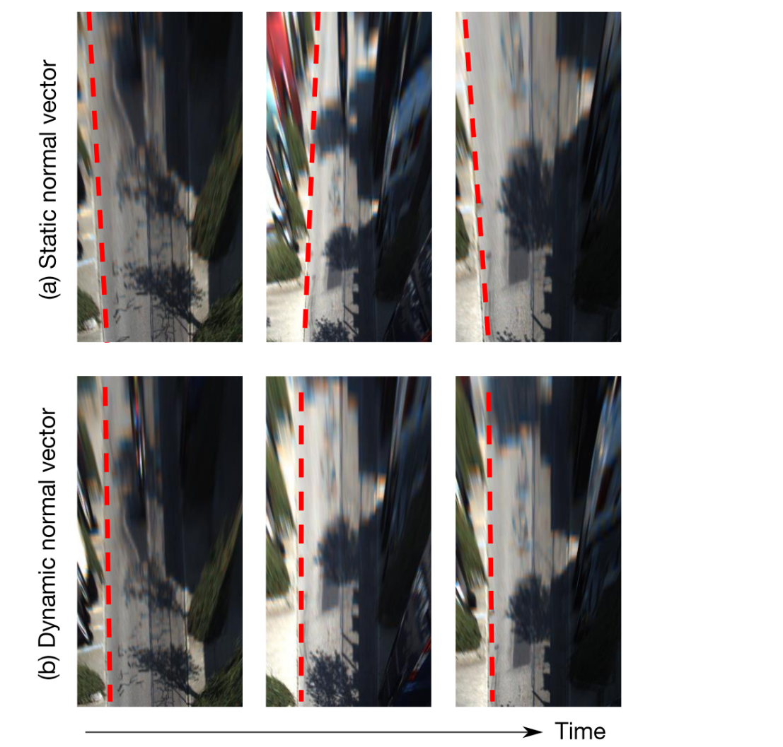 IEKF模型利用自车位姿与地平面法线的基本关系,建模车辆自运动的动态并实时估计地平面法线。该方法适用于多种传感器提供的自我运动信息,如单目相机和惯性测量单元(IMU)。在实验中,通过对比使用静态法线向量和动态法线向量的IPM图像,验证了本文提出方法的有效性。实验结果表明,使用动态法线向量后,IPM图像中的道路边缘更加平行和一致,图像质量显著提高。
