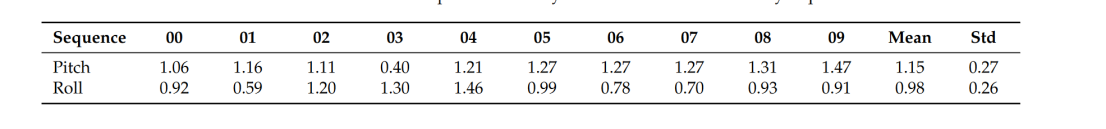 可以观察到俯仰和横滚角的平均变化约为1.2度和3.5度,分别。换句话说,地平面法线向量不是恒定的,而是在车辆移动时动态变化。类似地,下表呈现了所有KITTI里程计序列上横滚和俯仰动态的平均值。我们可以得出相同的结论:当车辆移动时,地平面法线不是恒定的(大约为1度)。这种不稳定性可能进一步影响自动驾驶任务的性能。