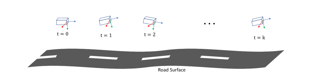 状态初始化:初始状态向量包含车辆的位姿和地平面法线向量。初始值可以通过静态条件下的简单测量或估计获得。