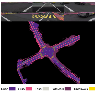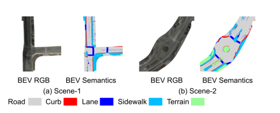 将 RoMe应用于野生数据,展示了它的多功能性。下图展示了RoMe重建的交叉路口。 渲染语义和源 RGB 图像之间的一致性是明显的,证明了RoMe的精度,有助于直接在道路网格上轻松注释 BEV 车道、路缘石、箭头、人行横道和其他静态道路元素。