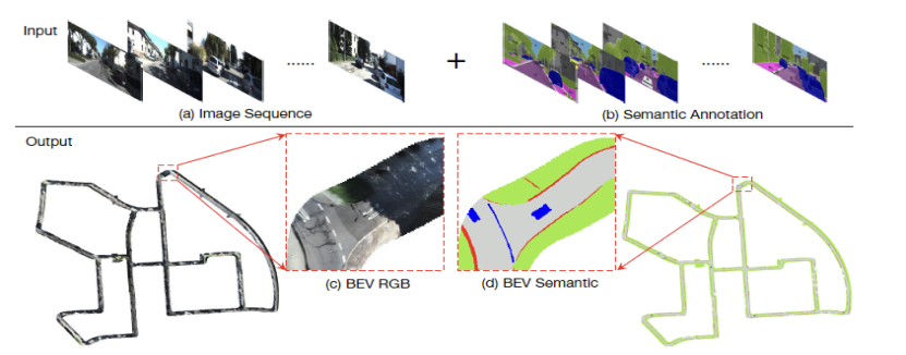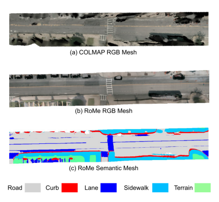 RoMe是一种仅依赖于图像的大规模路面重建的系统方法。在RoMe中,构思了一种道路网络,将3D路面描绘为具有一定细微高度的平滑网格。RoMe根据一系列的路面图像制作出全面的3D道路网格,并且辅以语义解释,每个网格顶点都封装了海拔高度,颜色和语义等详细信息。RoMe的大估摸路面重建效果如下图所示。